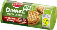 Dinkelmehl* (eine Weizenart) (44 %), Zucker*, pflanzliches Fett (Palm)*, stark entöltes Kakaopulver (3,4%)*, Maisstärke*, Glukosesirup*, Backtriebmittel (Natriumhydrogencarbonat, Ammoniumhydrogencarbonat), Meersalz| Energie | Fett | gesättigte Fettsäuren | Kohlenhydrate | Zucker | Eiweiss | Salz |