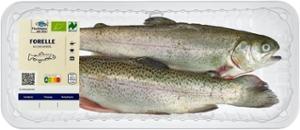 REGENBOGENFORELLE mit weisser Haut, ausgenommen und küchenfertigZutaten: FORELLE 100% *** (Oncorhynchus mykiss, aus ökologischer Aquakultur in Deutschland)| Energie | Fett | gesättigte Fettsäuren | Kohlenhydrate | Zucker | Eiweiss | Salz |