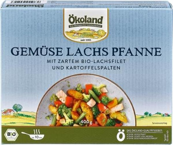 Bio-Pfannengericht mit Gemüse, frittierten Kartoffelspalten und Bio-Lachsfiletstücken, zum Braten, fein gewürzt, tiefgefroren