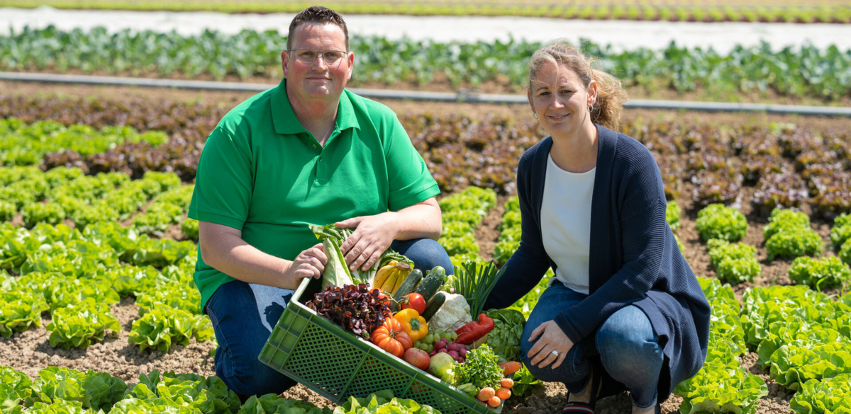 Christoph Decker uns Leonie Schittenhelm auf dem Acker mit einer Grünen Kiste voller Obst und Gemüse