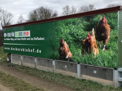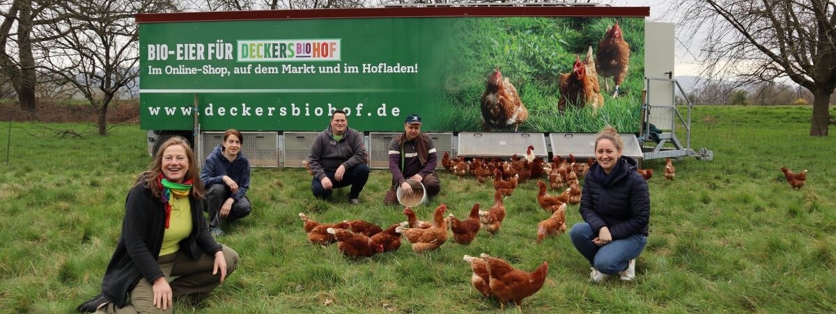 Familie Ibach betreibt in Bühl-Weitenung einen Chicken Trailer mit Hühnern, die regelmäßig umziehen, um sich von frischen Gräsern zu ernähren. Gegacker unter freiem Himmel für ein gutes Hühnerleben.